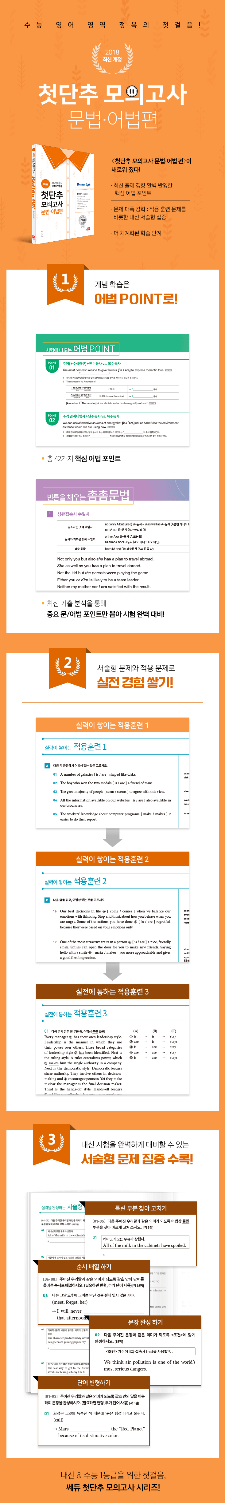 문제해결력과 적용력 향상에 초점이 맞추어져 효과적인 학습이 되도록 개념 정리, 반드시 출제되는 핵심 어법 포인트들, 그리고 이를 문장-짧은 문단-수능형으로 연결하는 체계적인 학습 단계로 구성하였다.