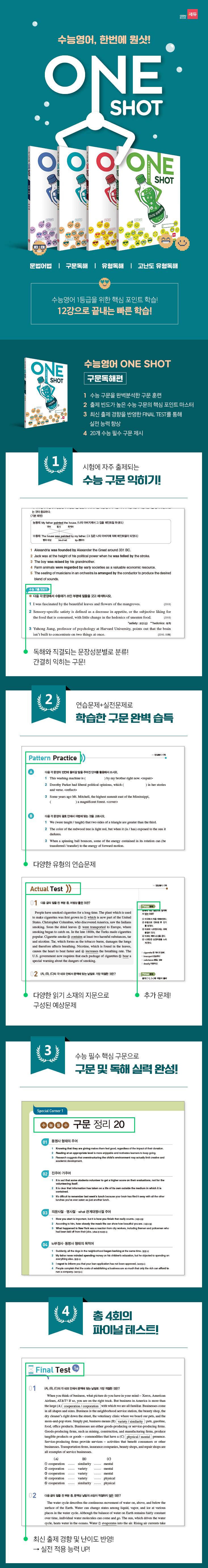 <쎄듀 수능영어원샷(ONE SHOT)>시리즈 중 <구문독해편>은 시험에 자주출제되는 수능 구문을 완벽 분석하여 독해와 직결되는 문장성분별로 분류하였다. 기출 구문과 다양한 유형의연습문제로 학습한 구문을 완벽하게 습득할 수 있도록 구성했다.