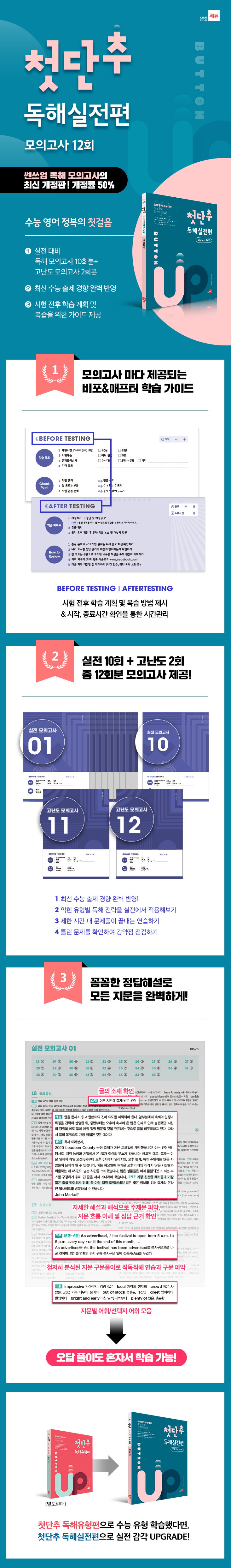 첫단추 Button Up 독해실전편 모의고사 12회는 <쎈쓰업 독해 모의고사>의 개정판으로, 고1~2 학력평가 수준의 난이도이다. 독해의 유형별 전략을 익힌 후 실전에 적용해볼 수 있도록 제작된 실전 모의고사 12회분이다.
