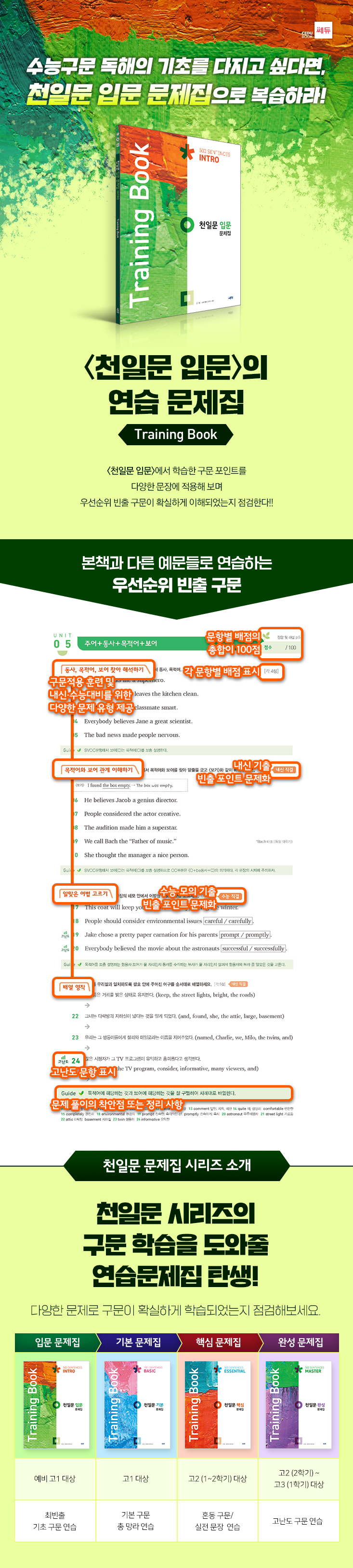<천일문 입문 문제집(Training Book)>은 <천일문 입문>의 연습문제집으로, 본책과는 다른 문장으로 출제한 다양한 유형의 문제를 통해, <천일문 입문>에서 학습한 구문의 기초를 점검해 볼 수 있다. 수능, 모의 및 내신 문제에 빈출되는 어법, 영작, 문장 전환 등의 문제 유형을 통해 실전 대비까지 가능하다. 구문 독해의 기초를 다지고 싶다면 ‘천일문 입문 문제집(Training Book)’으로 꼭 복습하길 추천한다.