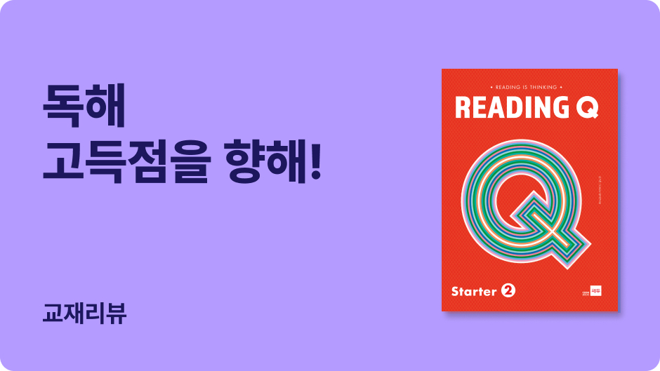 의 목표는 글의 흐름을 파악하고, 예측하는 연습을 통해 사고력 향상 문제들을 해결하도록 전략적으로 학습하는 것이다. 독해력이 부족한 수험생들과 내신과 수능에서 독해 고득점을 받고 싶은 수험생들에게 꼭 필요한 교재로, ‘독해 사고력을 키워주는 READING Q’를 강력히 추천한다.