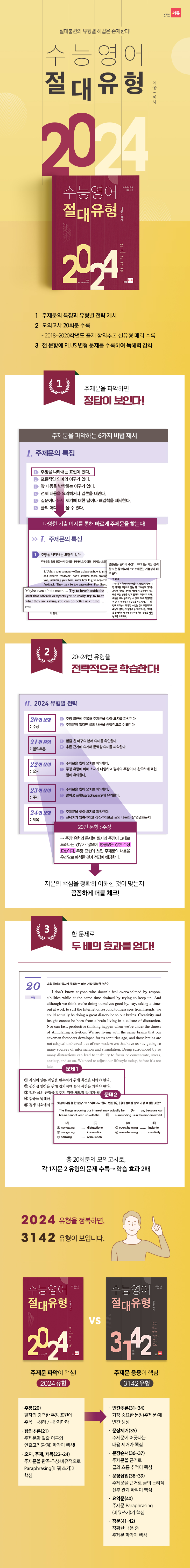 『수능영어 절대유형 2024』는 이를 위해 대의 파악 문제 유형(20번~24번)을 집중적으로 공략하도록 기획되었다. Part 1에서는 주제문의 특징과 20~24번의 유형별 전략을 학습하고, Part 2에서는 각 유형별 전략을 적용해보는 20회 미니 모의고사로 구성되어 있다. 또한, 2018학년도부터 다시 출제된 함의추론 문제도 매회 수록하여 더욱 탄탄히 대비할 수 있도록 하였다.