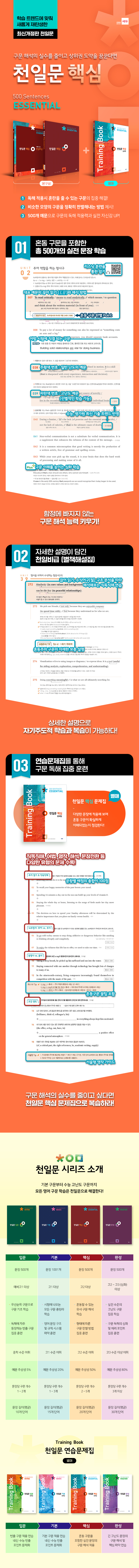 또한, 별도로 판매하고 있는 ‘천일문 핵심 문제집(Training Book)’은 본책과 다른 문장이 수록되어 있어 해당 구문을 담은 더 다양한 문장을 접할 수 있으며, 구문이 확실하게 학습이 되었는지를 점검해 볼 수 있다. 직독직해, 어법, 영작, 해석, 문장 전환 등 다양한 유형으로 구성되어 있다. 구문 해석의 실수를 줄이고 싶다면 천일문 핵심 문제집으로 꼭 복습하길 추천한다.