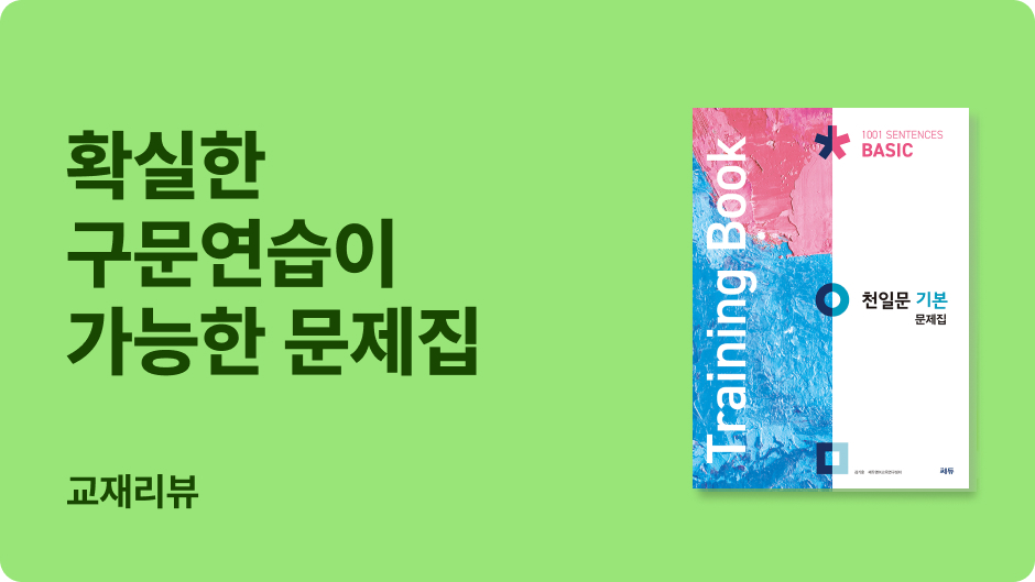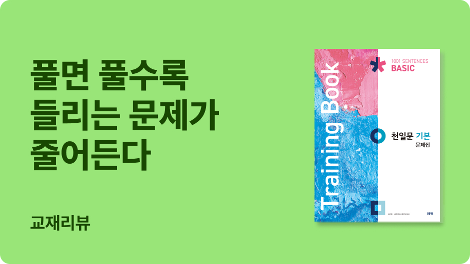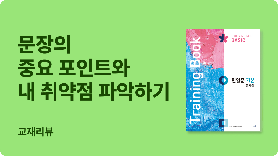 <천일문 기본 문제집(Training Book)>은 <천일문 기본>의 연습문제집으로, 본책과는 다른 문장으로 출제한 다양한 유형의 문제를 통해, <천일문 기본>에서 학습한 구문 개념을 적용하는 훈련을 할 수 있다. 수능, 모의 및 내신 문제에 빈출되는 어법, 영작, 문장 전환 등의 문제 유형을 통해 실전 대비까지 가능하다. 고등 독해를 위한 기본기를 탄탄히 다지고 싶다면 ‘천일문 기본 문제집(Training Book)’으로 꼭 복습하길 추천한다.