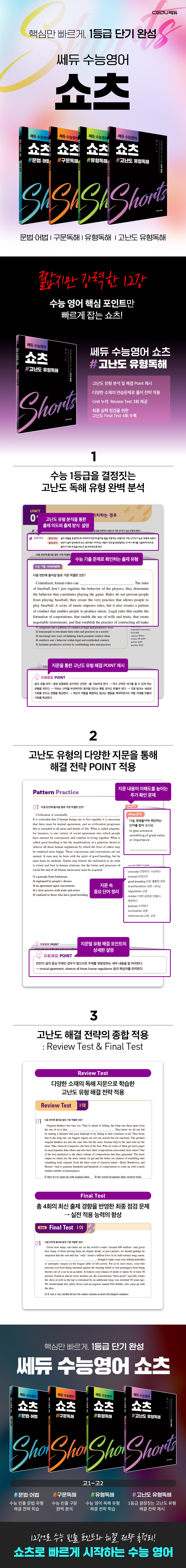 <수능영어 쇼츠(Shorts)>는 총 4권으로 구성되어 있으며, 단 12강으로 수능 영어 1등급을 위한 핵심 포인트를 빠르고 효과적으로 학습할 수 있도록 설계되었습니다. 수능 영어를 완벽하게 분석한 해결 전략은 물론, 다양한 유형의 연습 문제를 통해 학습한 내용을 체화하고, 종합 점검 Final Test로 실전 감각까지 완성할 수 있습니다.